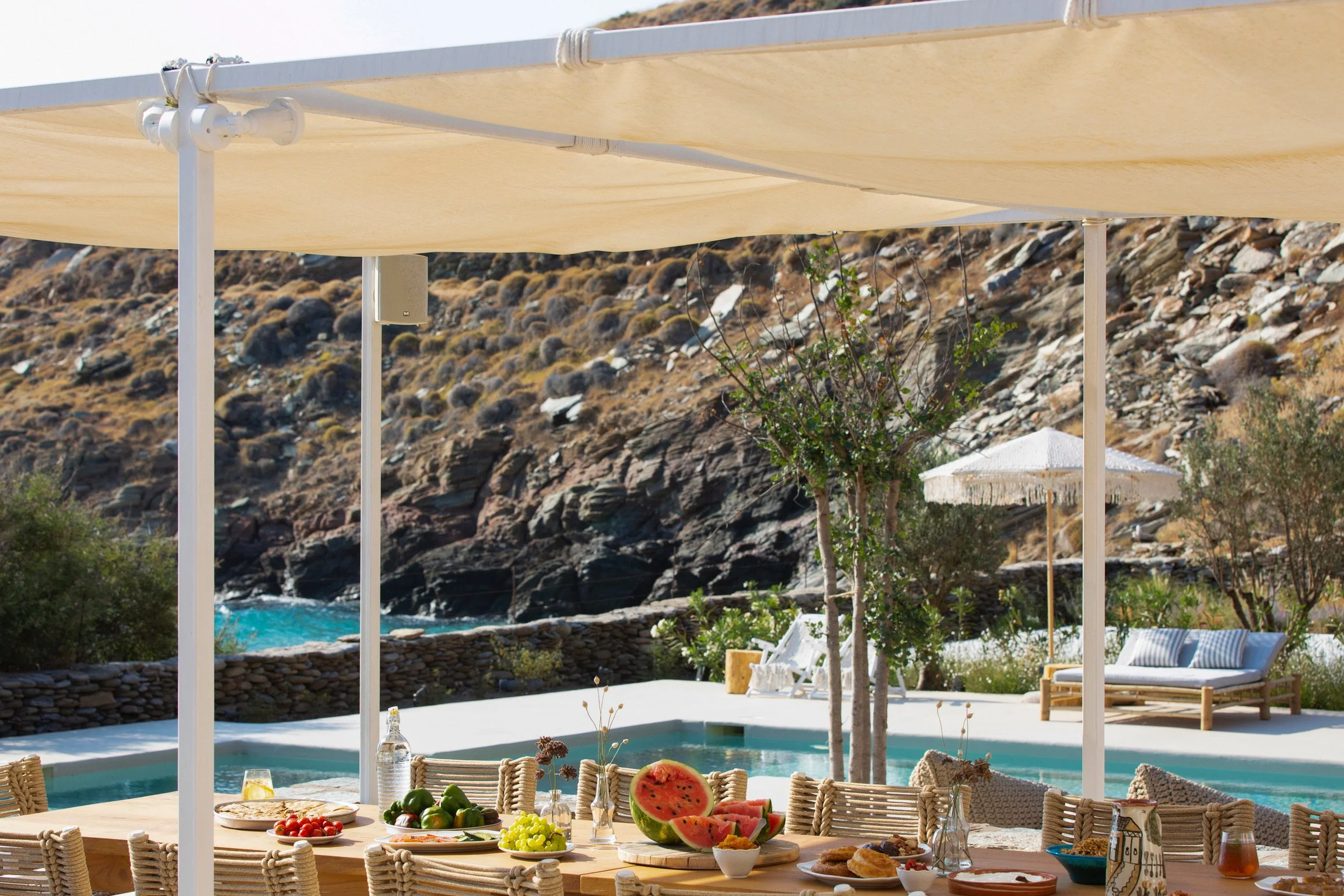 The retreat space includes a flourishing vegetable garden, large olive grove, and vineyard, all of which were planted using traditional Greek farming techniques providing an abundant, sustainable, and delicious experience for its guests. Paired with produce from local farmers and modern high end touches, all dishes embody a local, plentiful, and flavorful Greek quality.